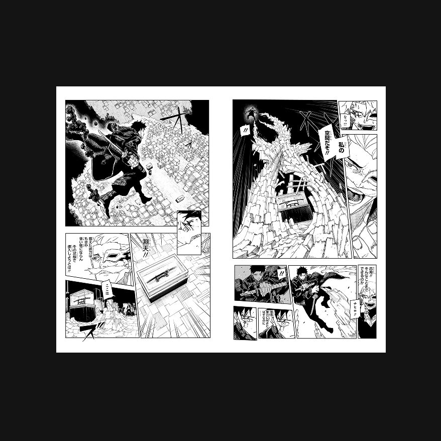 強大な力を持つ敵・漣京羅が支配する異空間に侵入した、主人公の千鉱。 天地がねじれた異空間にいる敵に対して、上から接近する様子を大迫力で描いている。 見開きの左右で、最初は主人公の目線による上からの構図、続いてそれを迎撃する敵の下からの構図となるよう、構成されている。