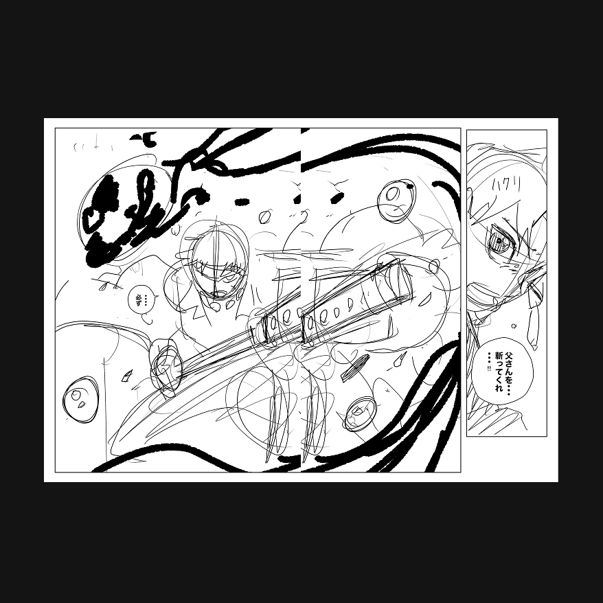 伯理の決意に満ちた表情、宙を舞う「錦」の金魚、力強く淵天を引き抜く千鉱と、ページの魅力となる要素は下書きの時点で全てイメージが出来上がっている。千鉱の傍らで泳ぐ「錦」の金魚の流れるような尾も、下書き時点で構図が決まっている。